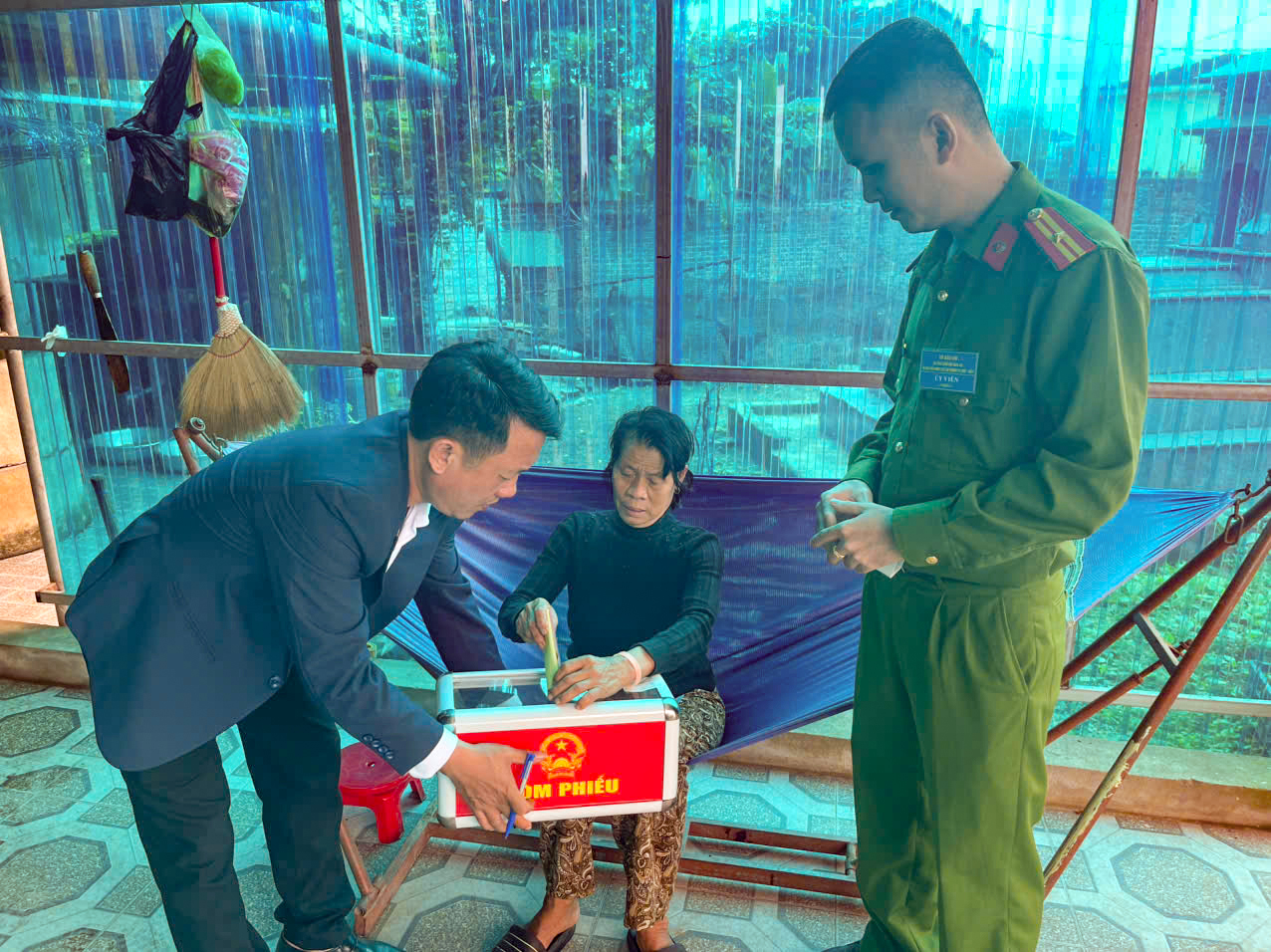 Cử tri Nguyễn Thị Danh (thôn Hội Minh), bị bệnh nặng nên tổ bầu cử đã dùng hòm phiếu phụ đến tận nhà để thực hiện quyền công dân.
