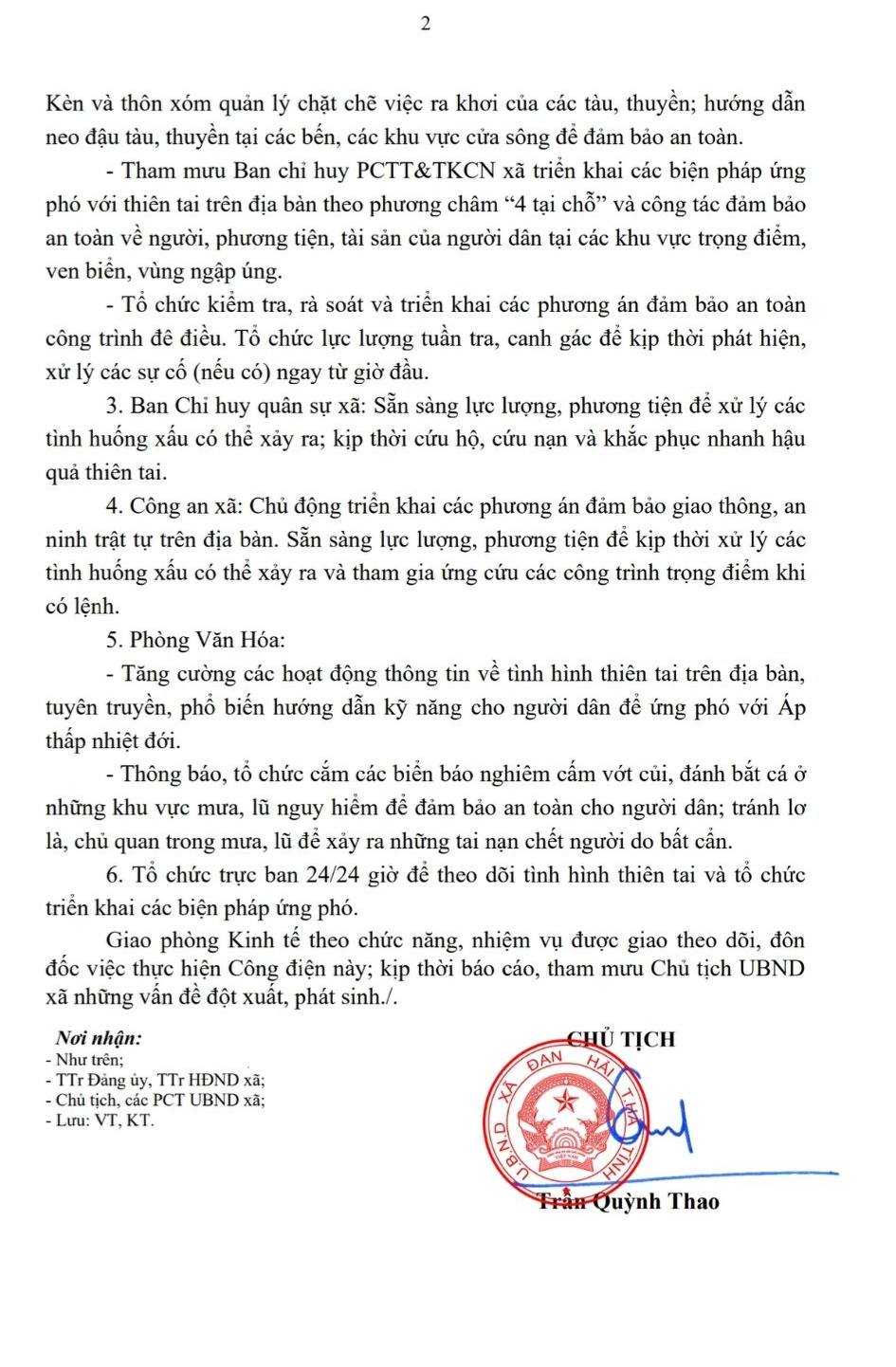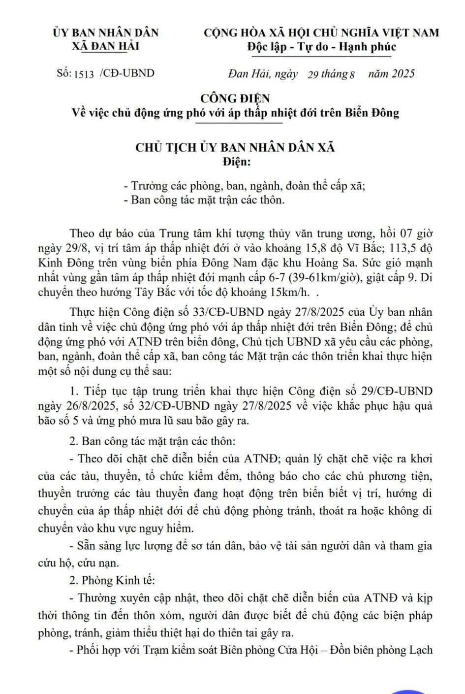 Thực hiện chỉ đạo của UBND tỉnh về việc chủ động ứng phó với mưa lớn ở biển Đông. Ngày 29/8/2025, UBND xã Đan Hải ban hành Công điện về việc Chủ động ứng phó với áp thấp nhiệt đới trên Biển Đông.