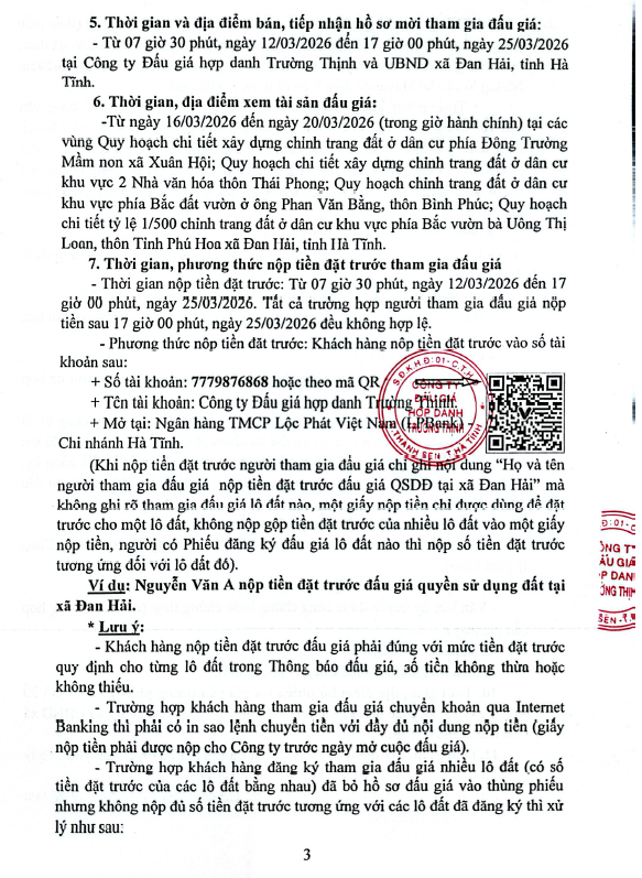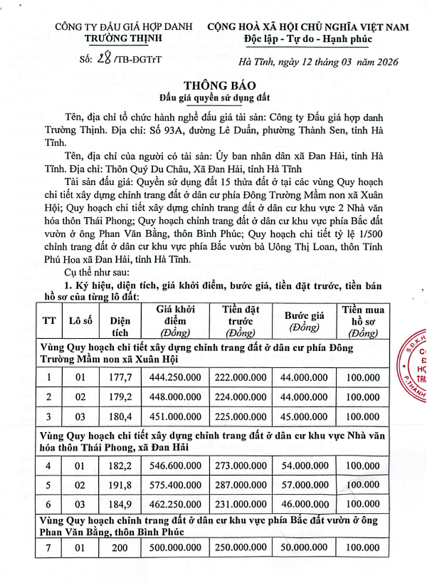 Đan Hải: Thông báo đấu giá quyền sử dụng đấtBBT20/03/2026A -A+BBT20/03/2026A -A+Thông báo đấu giá quyền sử dụng đất năm 2026 File đính kèm20.3 THÔNG BÁO ĐẤU GIÁ XÃ ĐAN HẢI.pdf