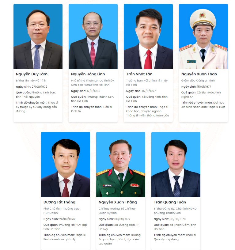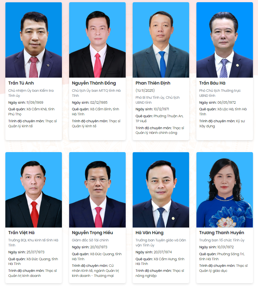 Danh sách Ủy viên Ban Thường vụ Tỉnh ủyNguồn: https://baohatinh.vn/02/10/2025A -A+Nguồn: https://baohatinh.vn/02/10/2025A -A+ỦY VIÊN BAN THƯỜNG VỤ(Sắp xếp theo thứ tự A, B, C...).