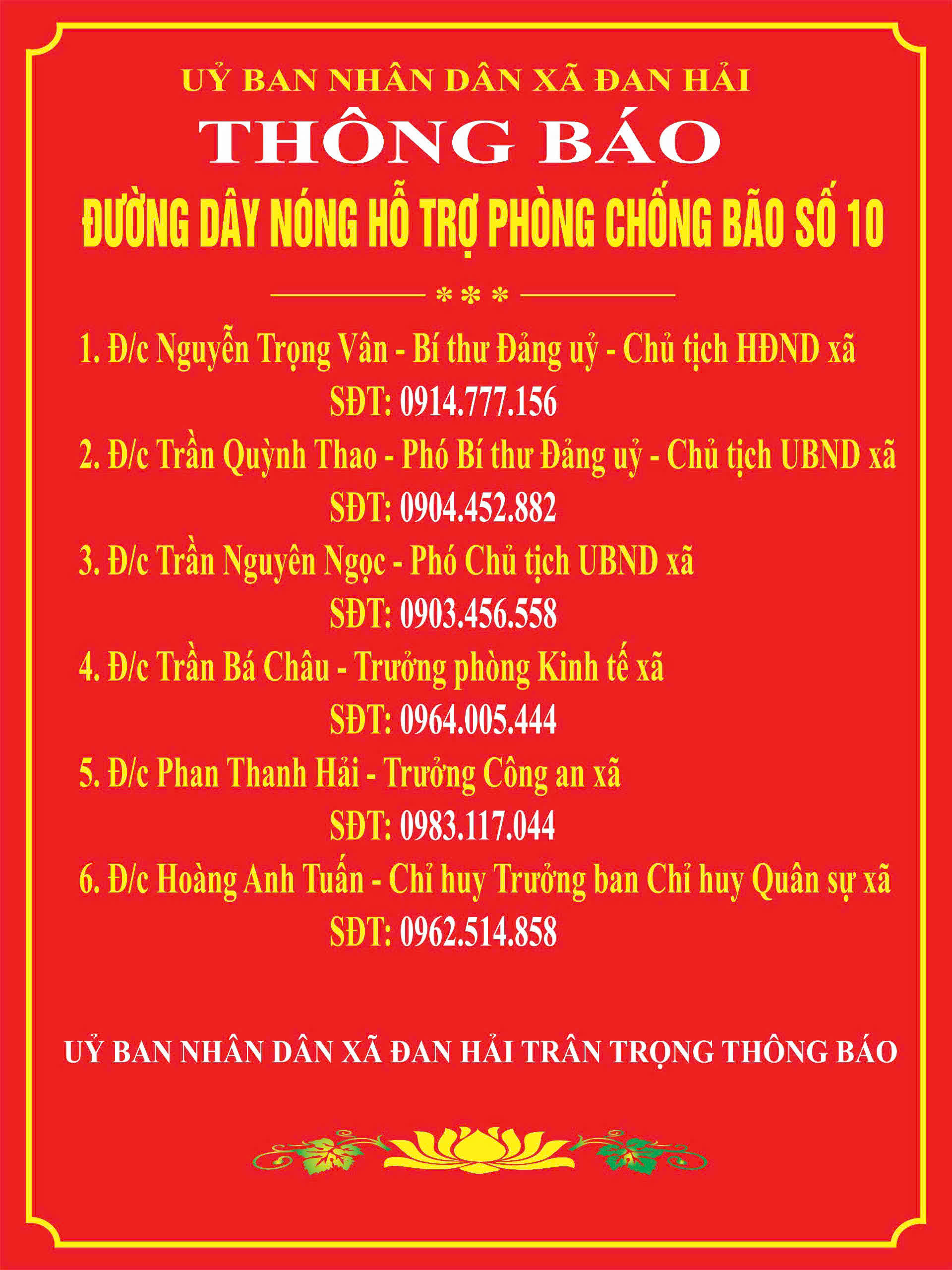 Đường dây nóng hỗ trợ bão số 10UBND xã Đan Hải29/09/2025A -A+UBND xã Đan Hải29/09/2025A -A+Đường dây nóng hỗ trợ bão số 10
