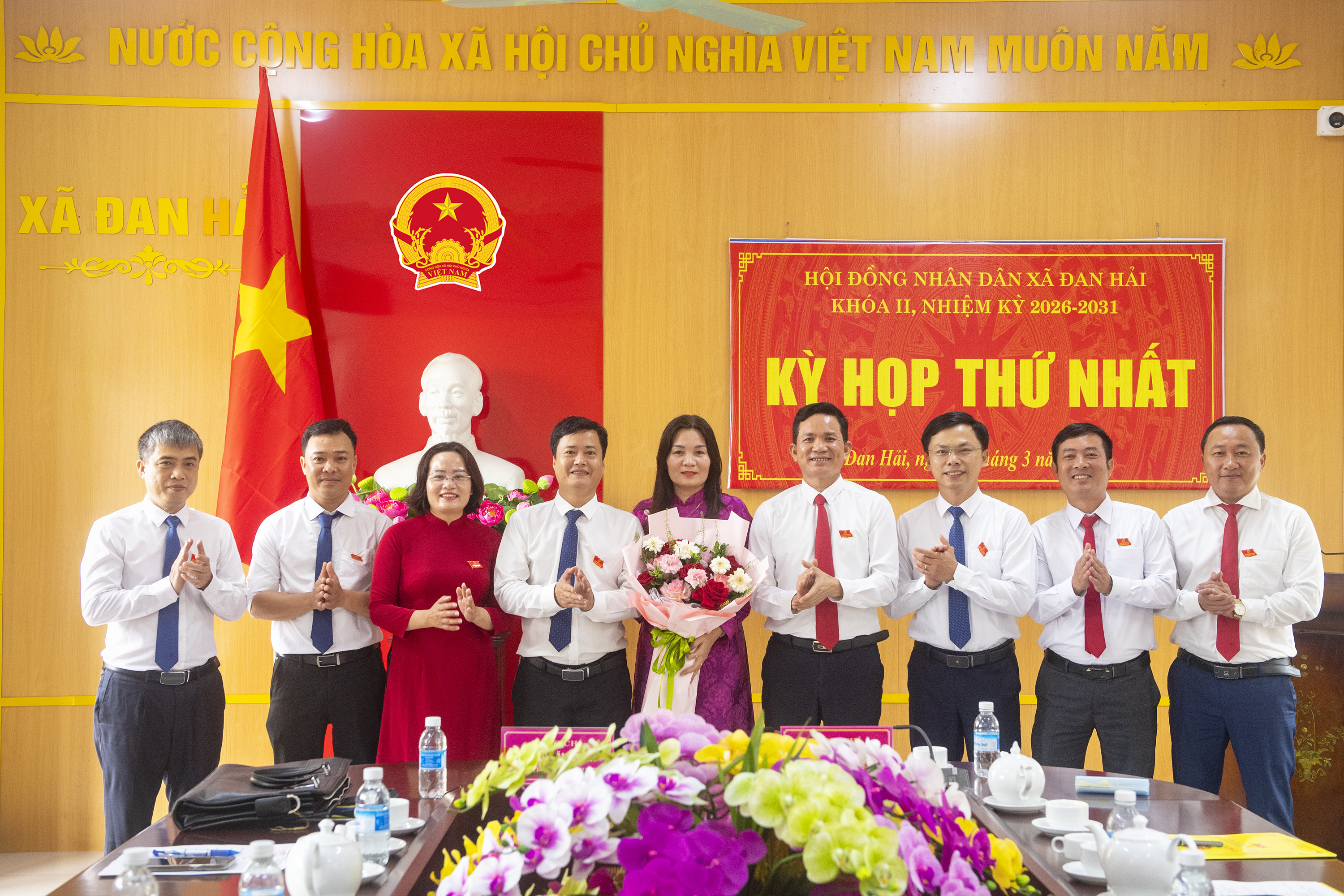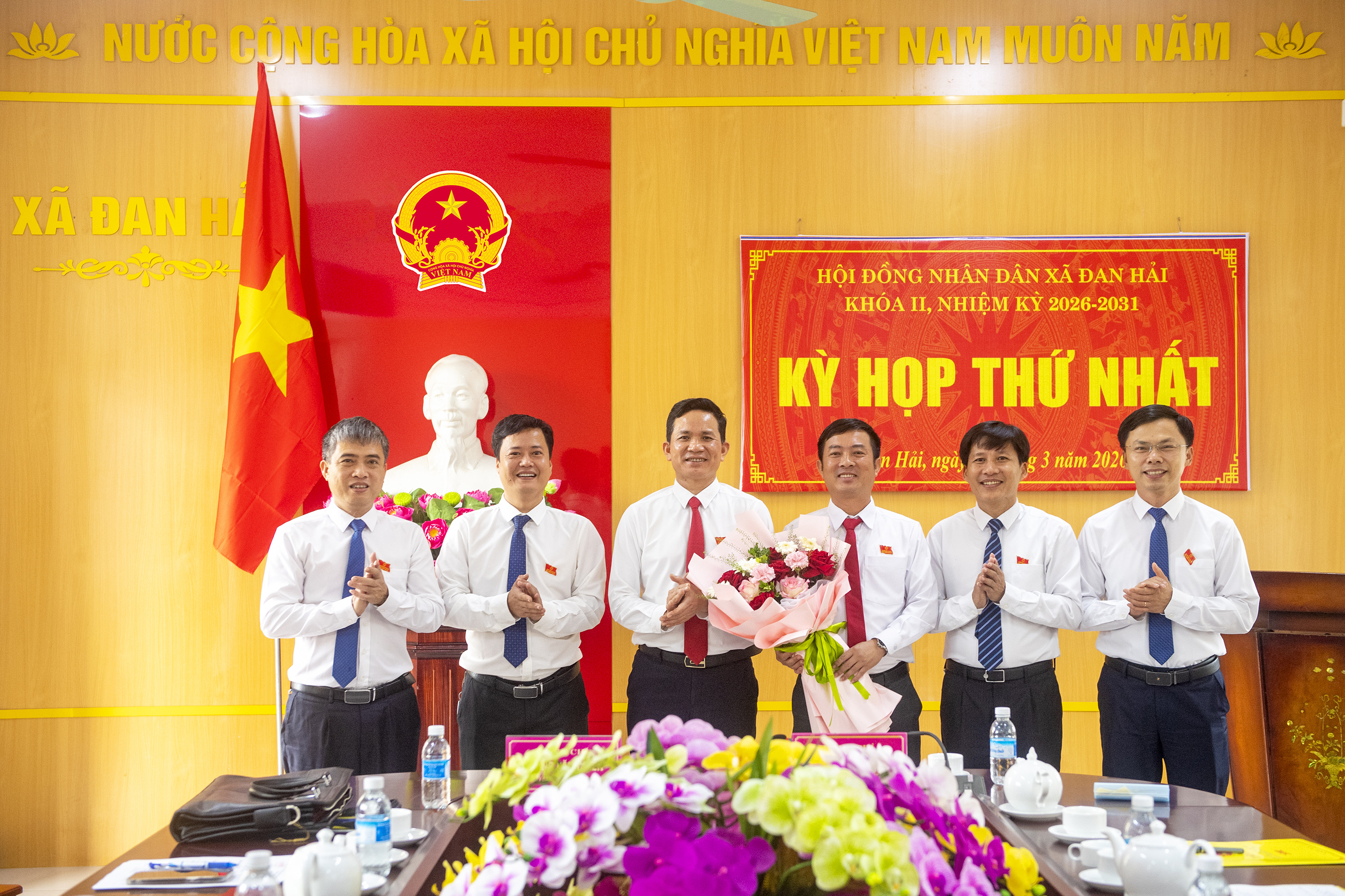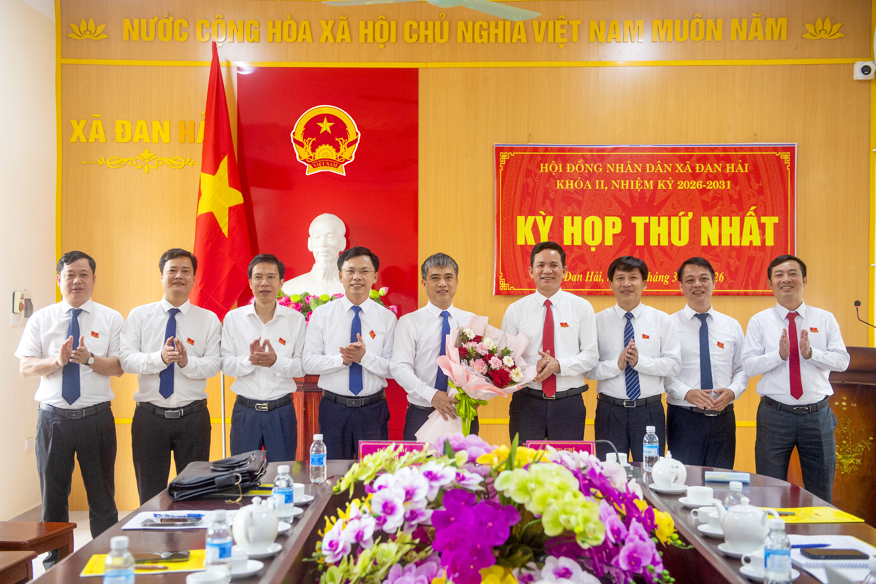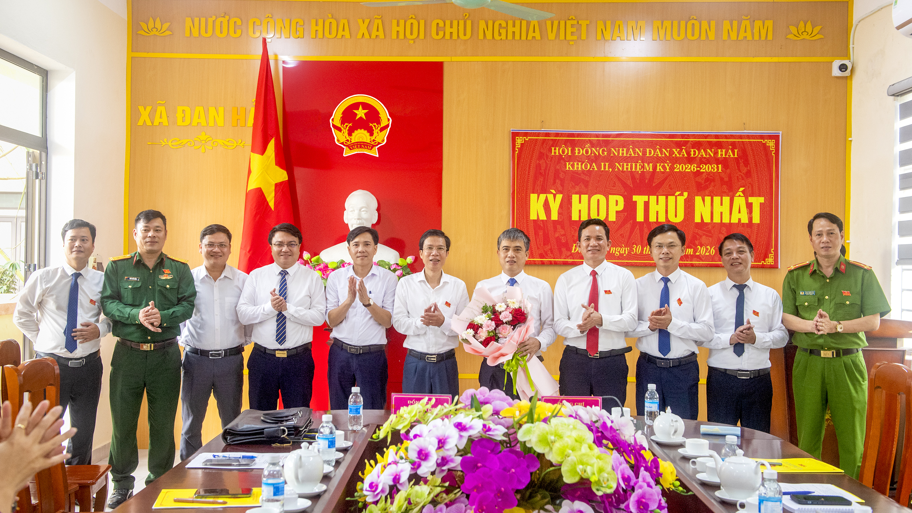 Các đại biểu tặng hoa chúc mừng các đồng chí trúng cử các chức danh chủ chốt HĐND, UBND xã Đan Hải nhiệm kỳ 2026-2031