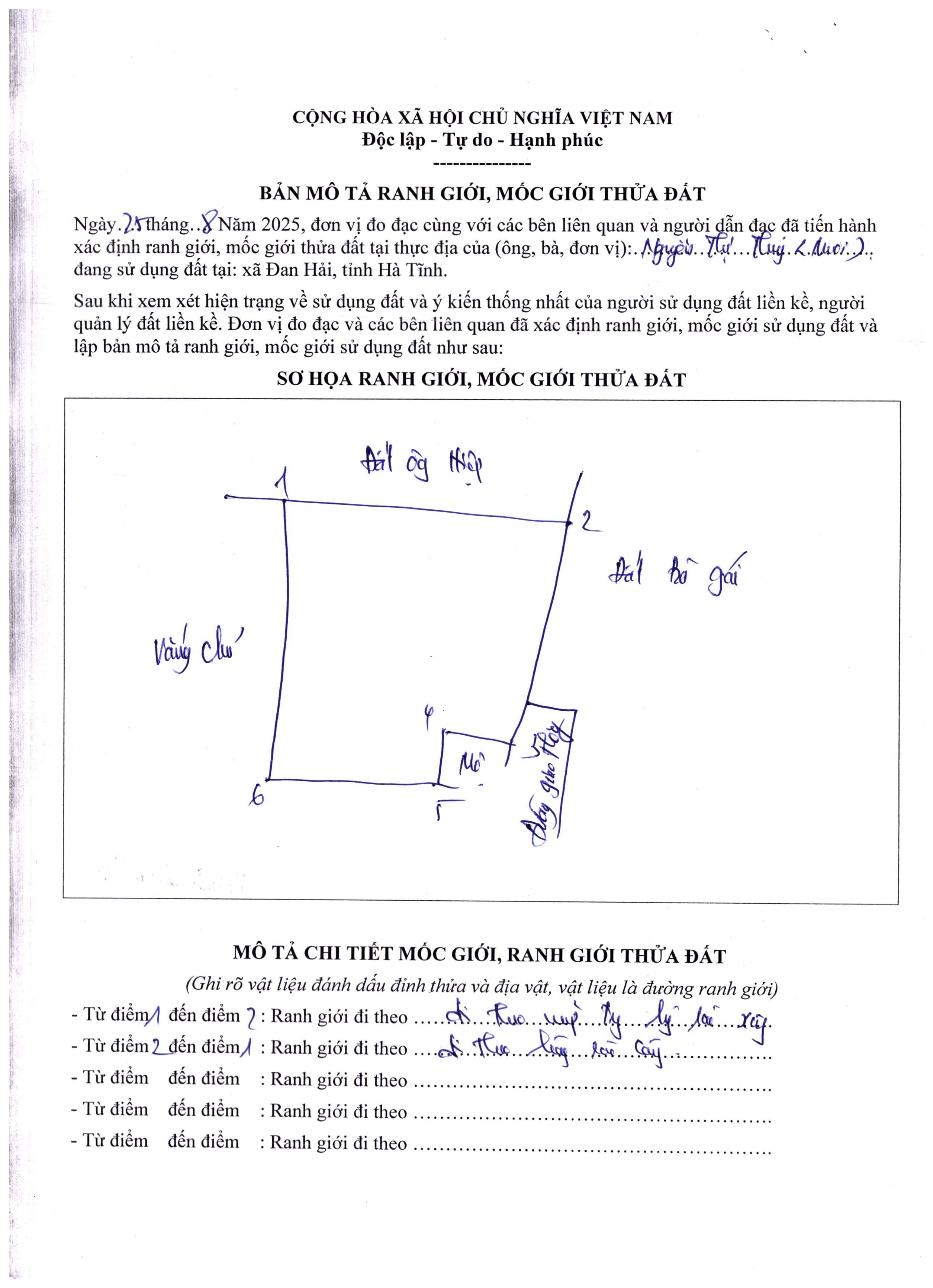 Căn cứ Văn bản số 976/VPĐK-CNNX ngày 29/8/2025 của Văn phòng Đăng ký đất đai tỉnh Hà Tĩnh - Chi nhánh huyện Nghi Xuân về việc chuyển bản mô tả ranh giới, mốc giới thửa đất để thực hiện việc công khai của ông Trần Đức Nuôi, thôn Trường An;