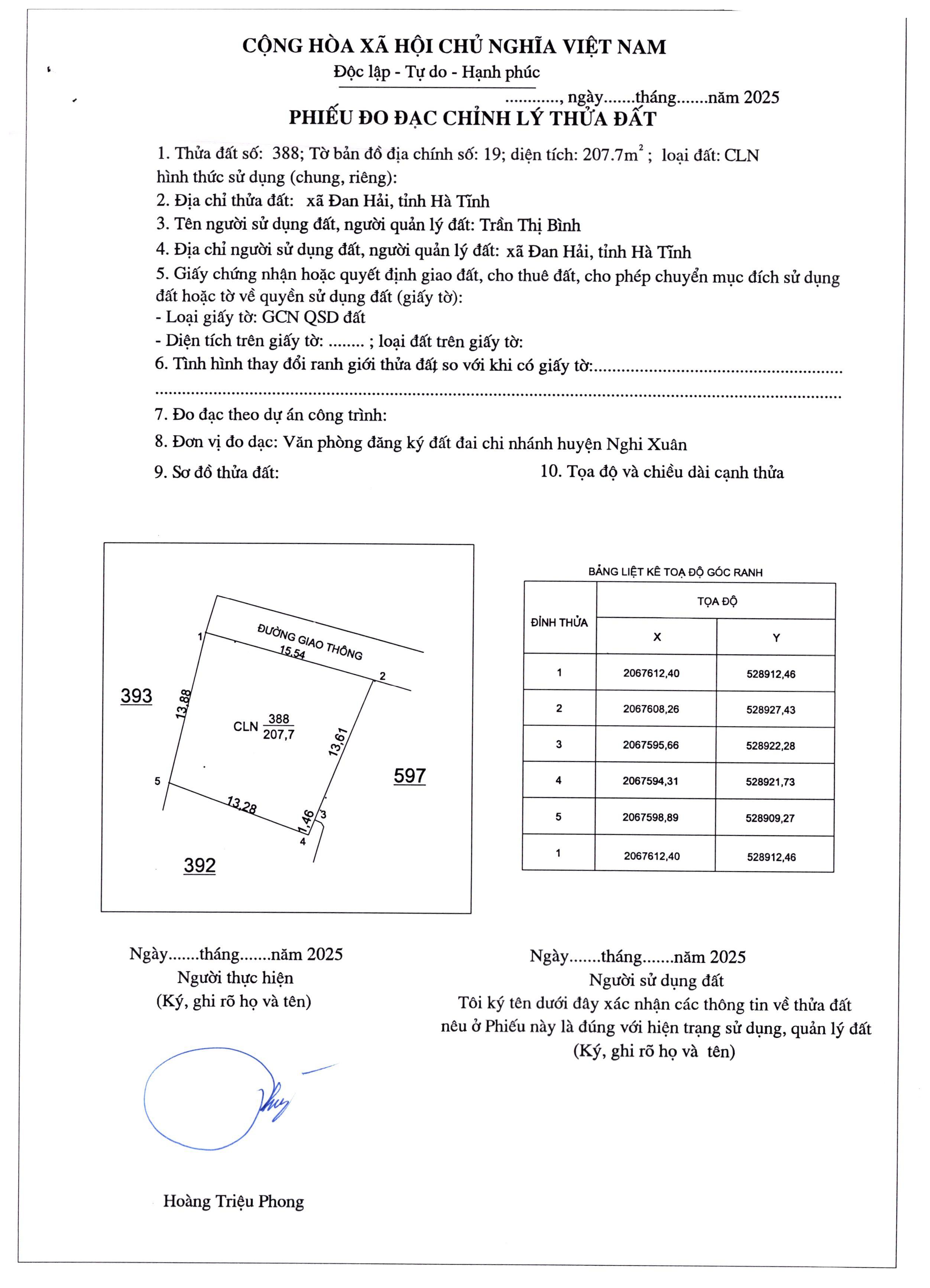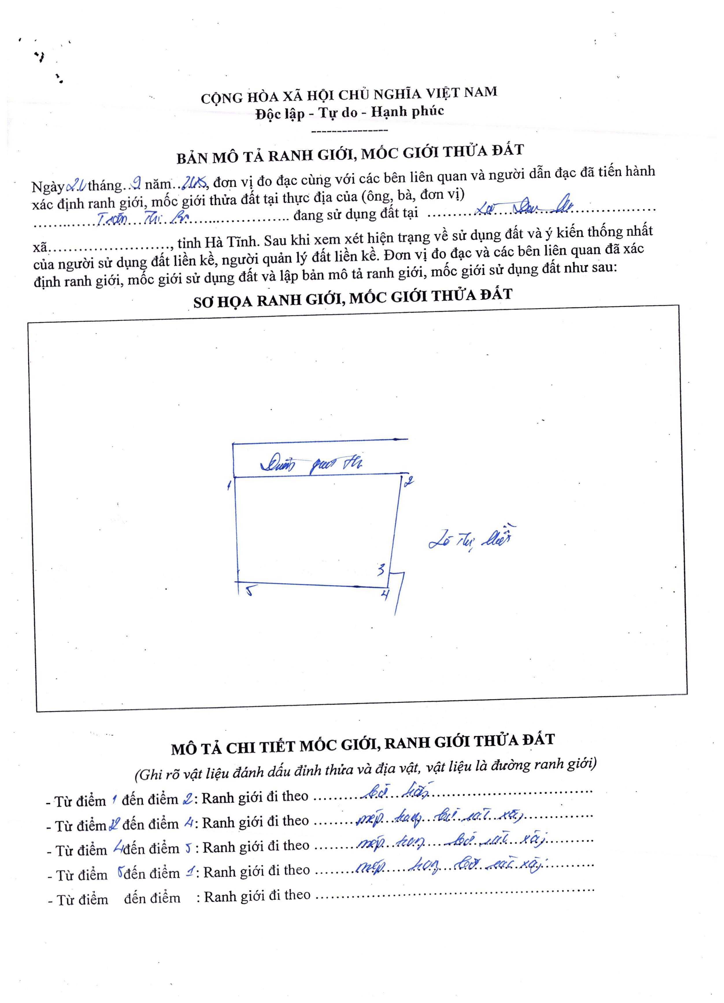 Căn cứ Văn bản số 996/VPĐK-CNNX ngày 04/9/2025 của Văn phòng Đăng ký đất đai tỉnh Hà Tĩnh - Chi nhánh huyện Nghi Xuân về việc chuyển bản mô tả ranh giới, mốc giới thửa đất để thực hiện việc công khai của ông Trần Đức Nuôi, thôn Thống Nhất;