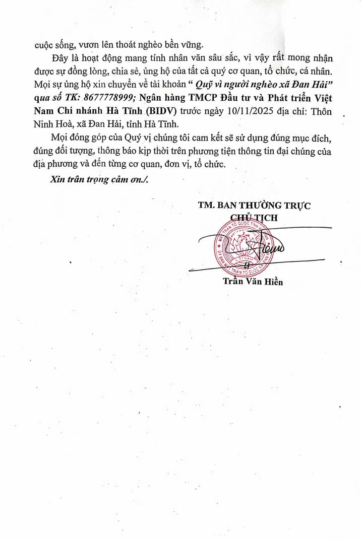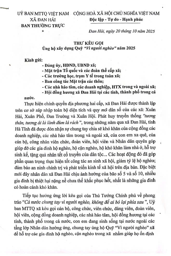 Thư kêu gọi ủng hộ quỹ vì người nghèo năm 2025Lê An - VHXH20/10/2025A -A+Lê An - VHXH20/10/2025A -A+Ủy ban Mặt trận Tổ quốc Việt Nam xã Đan Hải kêu gọi ủng hộ Quỹ vì người nghèo năm 2025. .