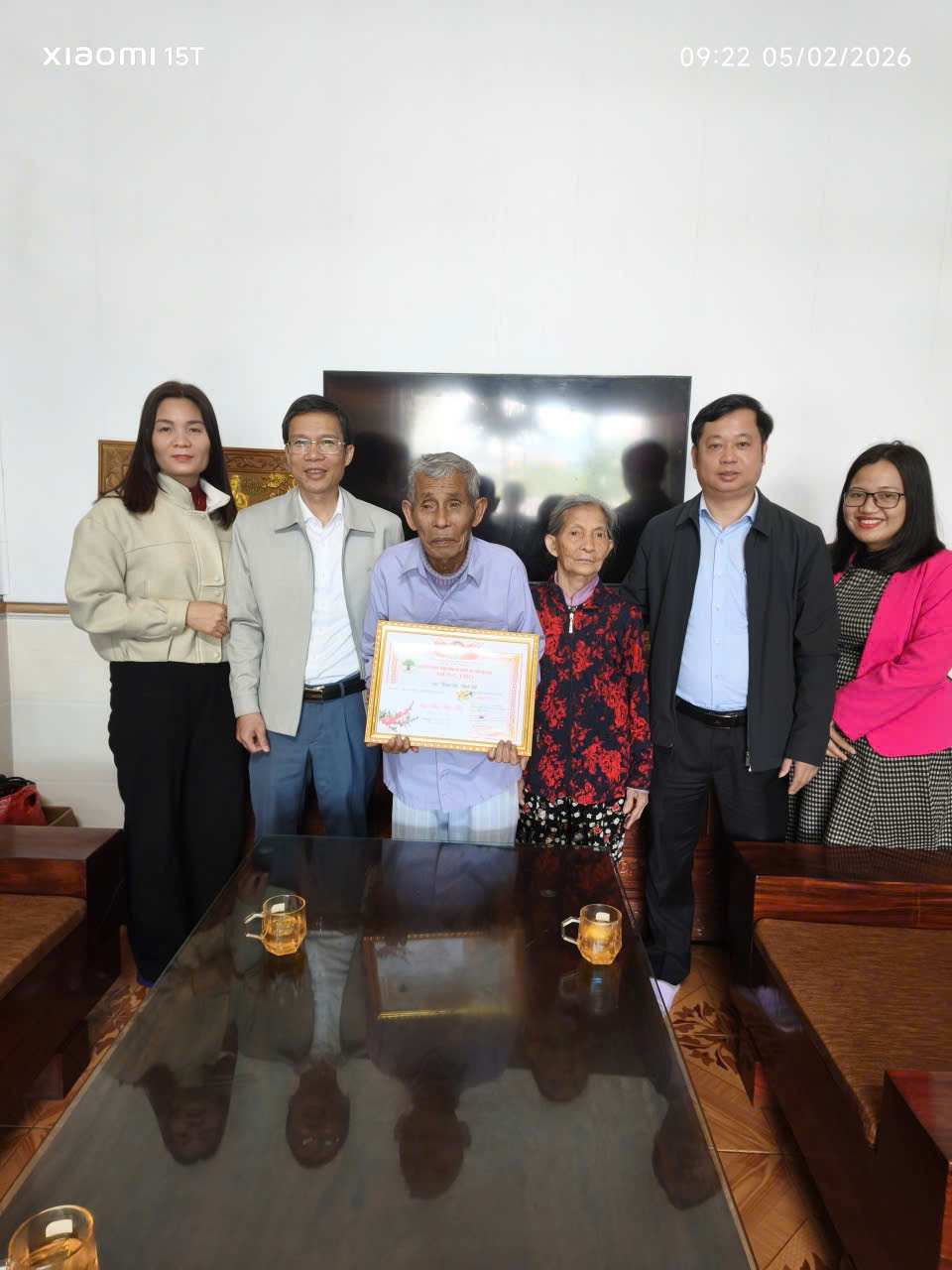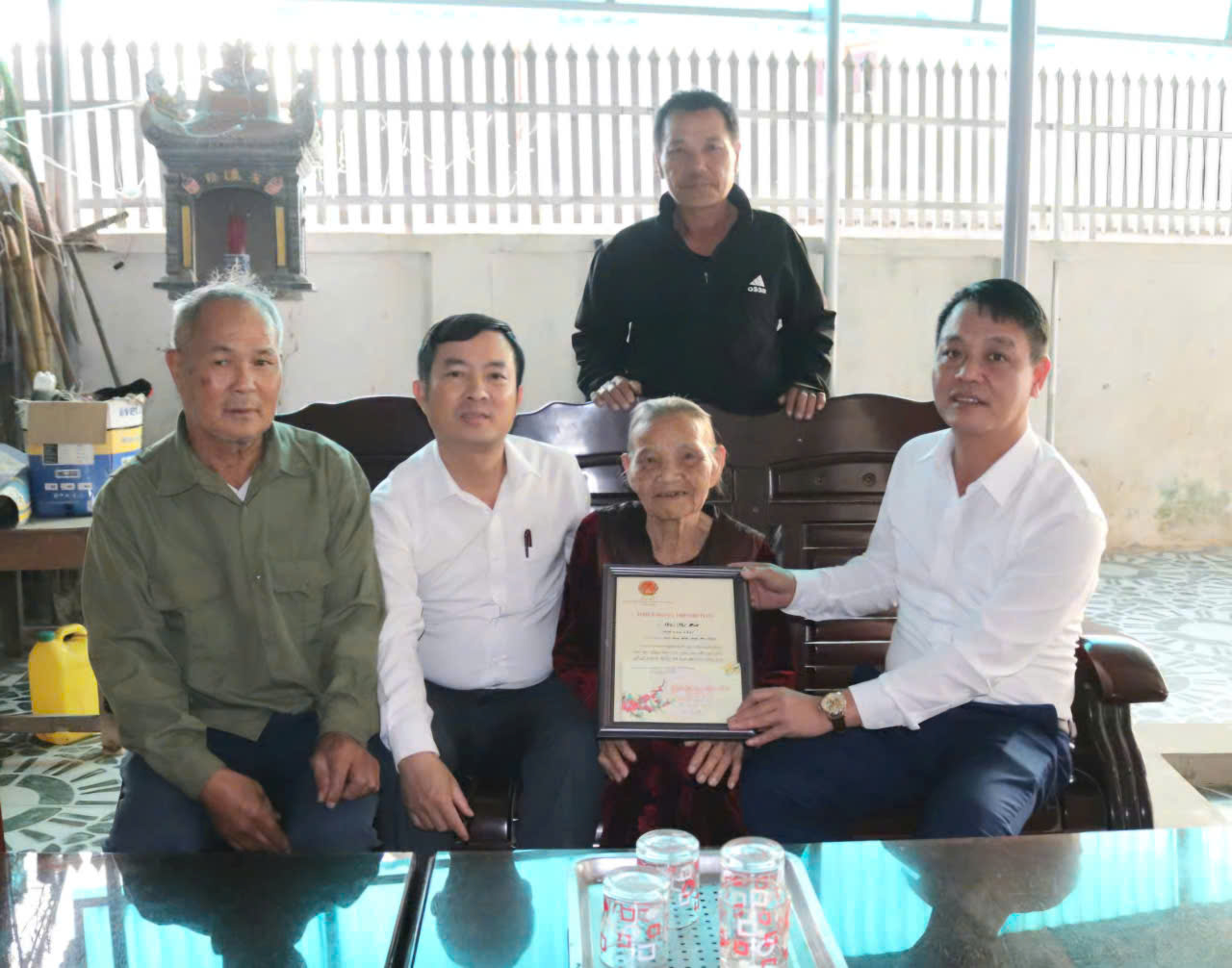 Đoàn do đ/cTrần Nguyên Ngọc - Ủy viên BTV Đảng ủy, PCT UBND xã trưởng đoàn đến chúc thọ cụ Trần Tiu, trên 100 tuổi, thôn Tân Ninh Châu