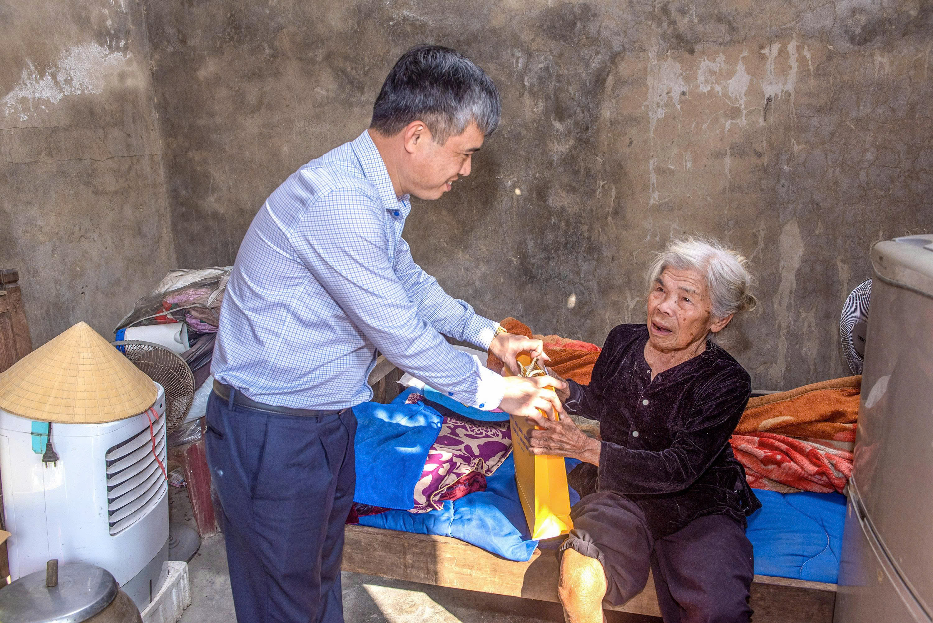 Đồng chí Trần Quỳnh Thao – Phó Bí thư Đảng ủy, Chủ tịch UBND xã trao quà, thăm hỏi bà Trần Thị Vân, thôn Song Giang